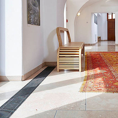 Durch die moderne und fast unsichtbare Integration der Heizkörper in den Boden bleiben die großen Fensterfronten unverstellt und ermöglichen so eine elegante Innenraumgestaltung. Die Systemelemente eröffnen Architekten dabei auch vielfältige Gestaltungsmöglichkeiten.