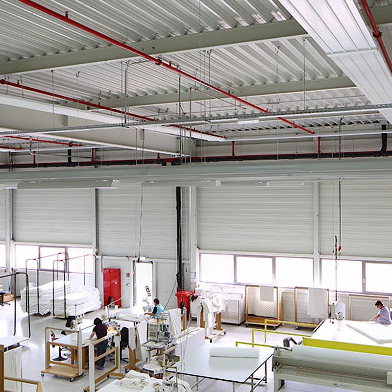 Durch die Montage unter der Decke wird kein Raum in der Halle verschwendet und die angenehme Wärme ist sowohl für die Mitarbeiter als auch für die Produktionsgüter positiv. Mit ihrer geringen Aufheiz- bzw. Abkühlzeit sorgen die Deckenheizplatten für eine gleichmäßige Temperaturverteilung.