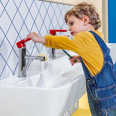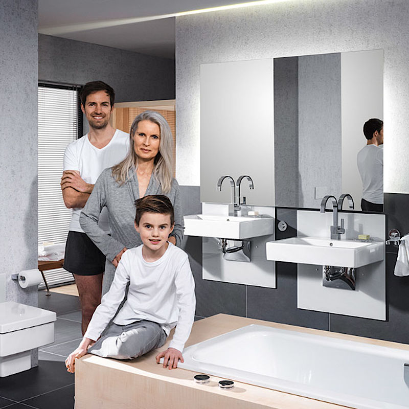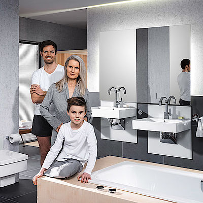 Im Familienbad sind reinigungsfreundliche Oberflächen das A und O der Badsanierung. Runde Waschbecken vermindern zudem das Verletzungsrisiko im gemeinsamen Bad. Ebenso sollten direkt mehrere Waschbecken in Ihrem neuen Bad einen Platz finden. So können Kinder und Eltern gleichzeitig das Bad nutzen. Wer bei der Badplanung direkt ein niedriges Kinderwaschbecken vorsieht, spart sich später die Wackelpartie aus dem Kinderhocker.
